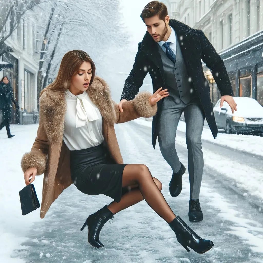 Angie rushed out of the apartment and down to the sidewalk. She was late for work. She couldn't find good shoes with traction and had to wear a pair with a thin heel, and it was icy out.