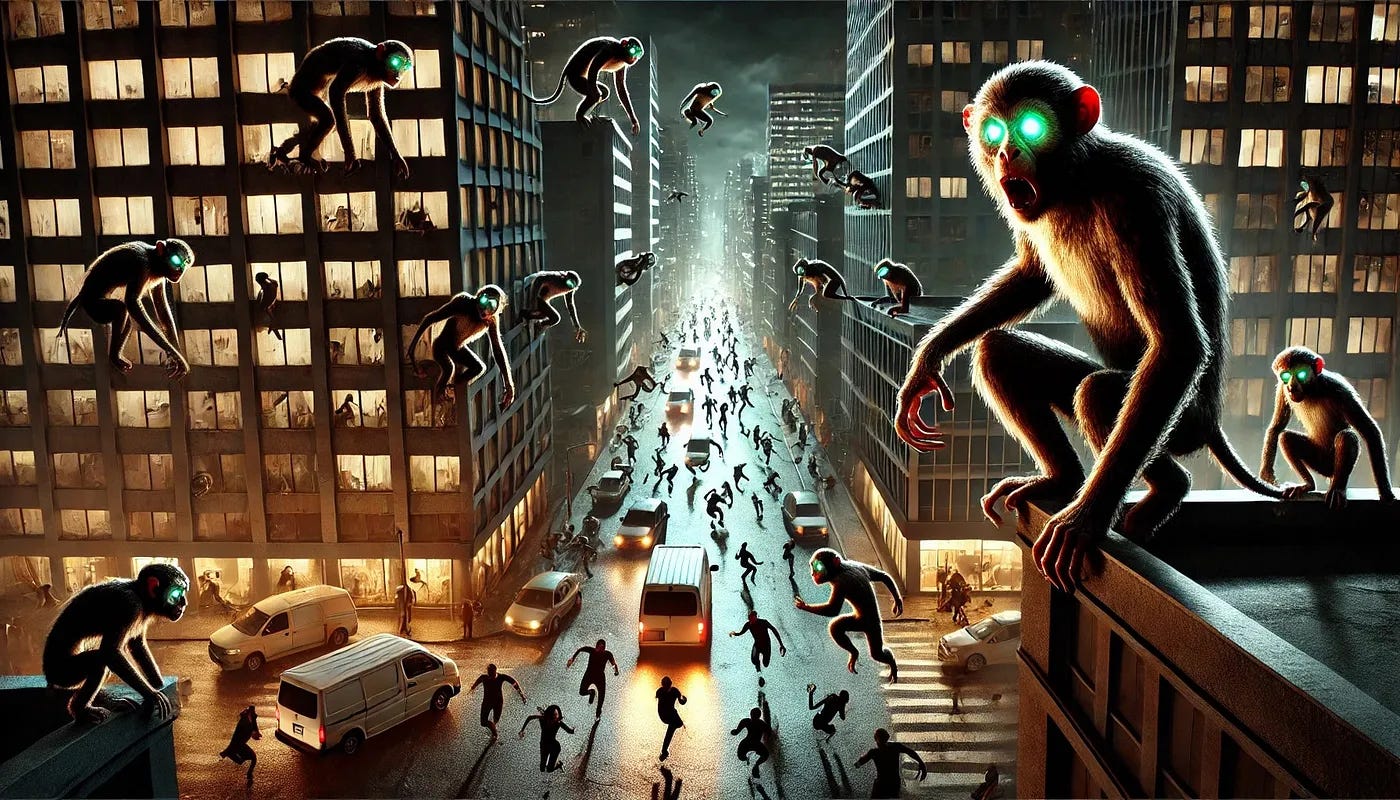 These monkeys weren’t just smart — they carried a deadly virus made in the lab. Their eyes glowed with eerie light as they climbed buildings and jumped from rooftops.